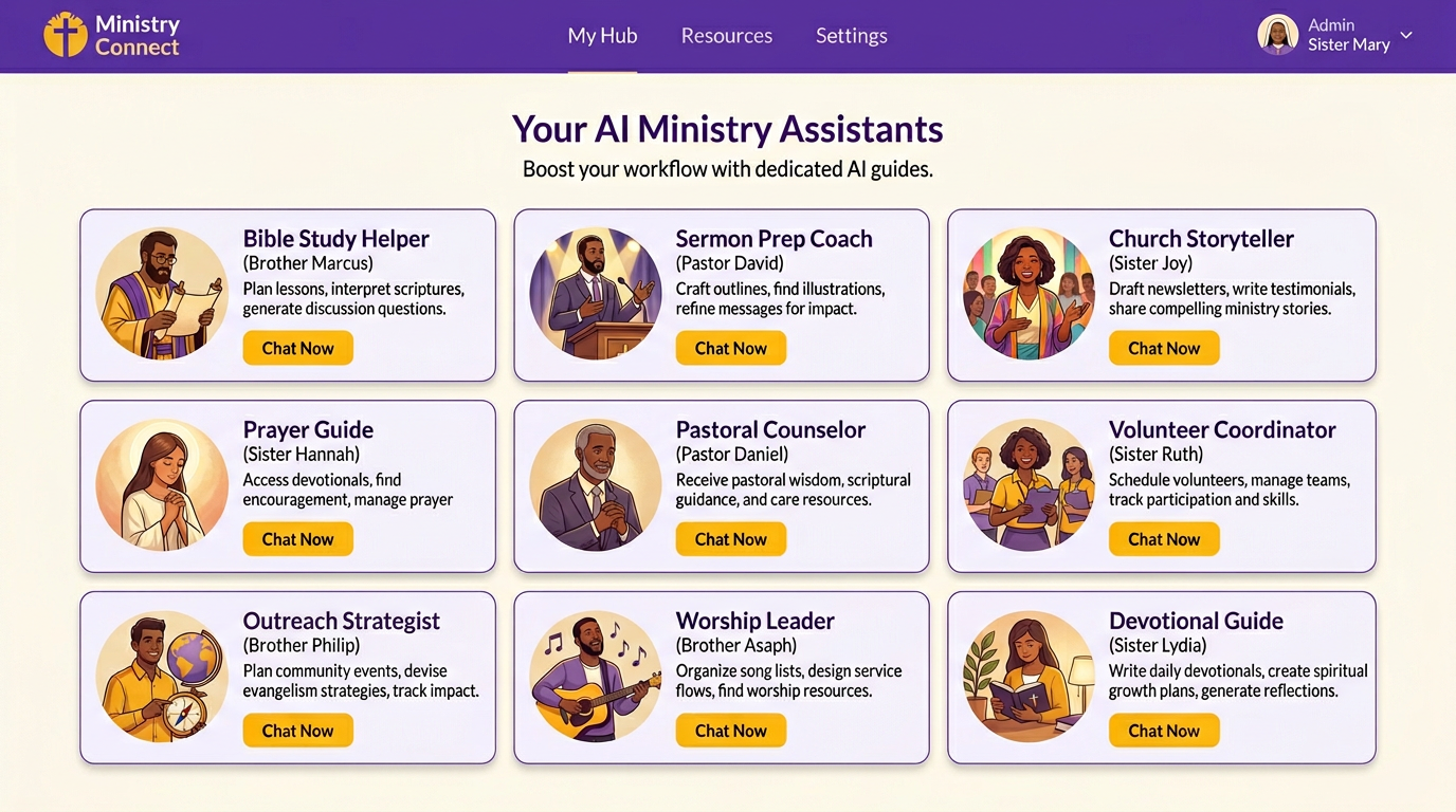 Chat with AI assistants trained for church and ministry work — from sermon preparation and Bible study to pastoral care, youth ministry, and church administration. Each assistant is ready to help you create, plan, and communicate more effectively.